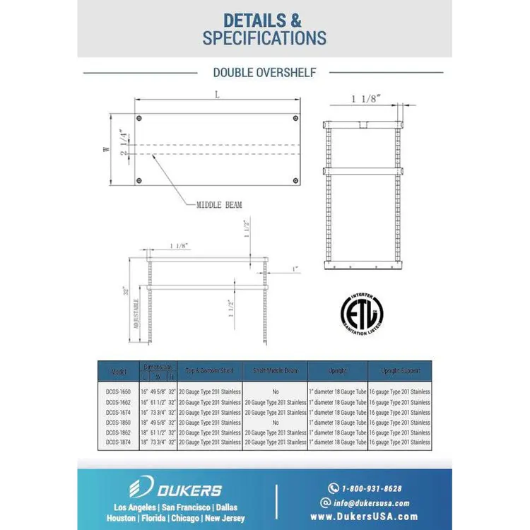 The Dukers double overshelf fits comfortably over our undercounters and refrigerated food prep tables to add extra storage on top.